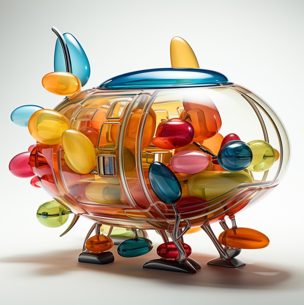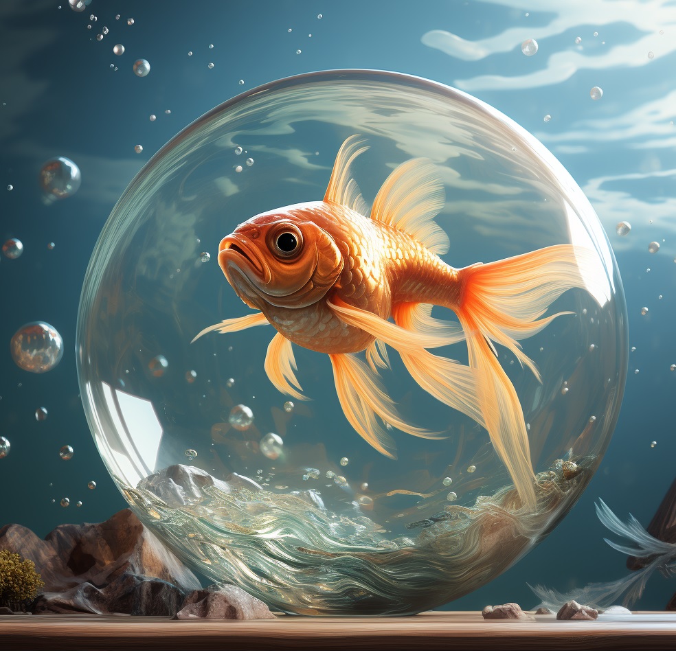 A luminous goldfish suspended inside a transparent sphere of water and air.