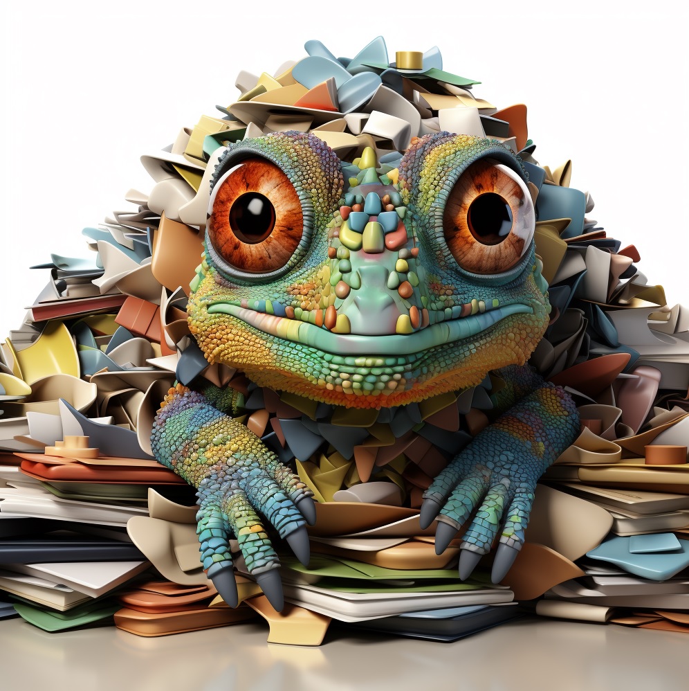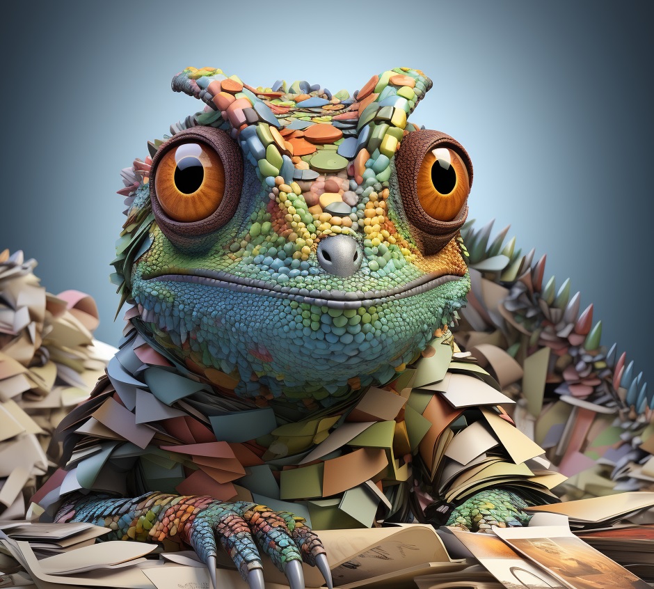 A chameleon formed from layered fragments, wearing memory like a changing skin.