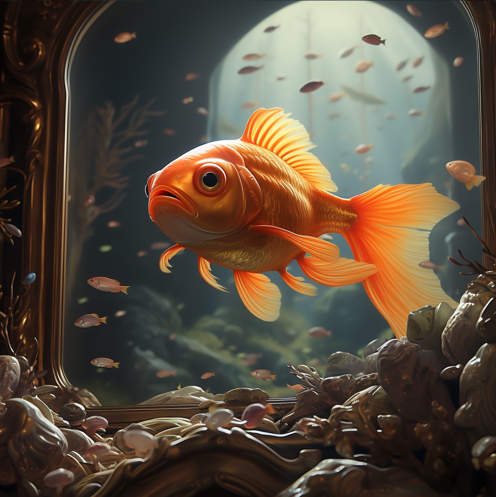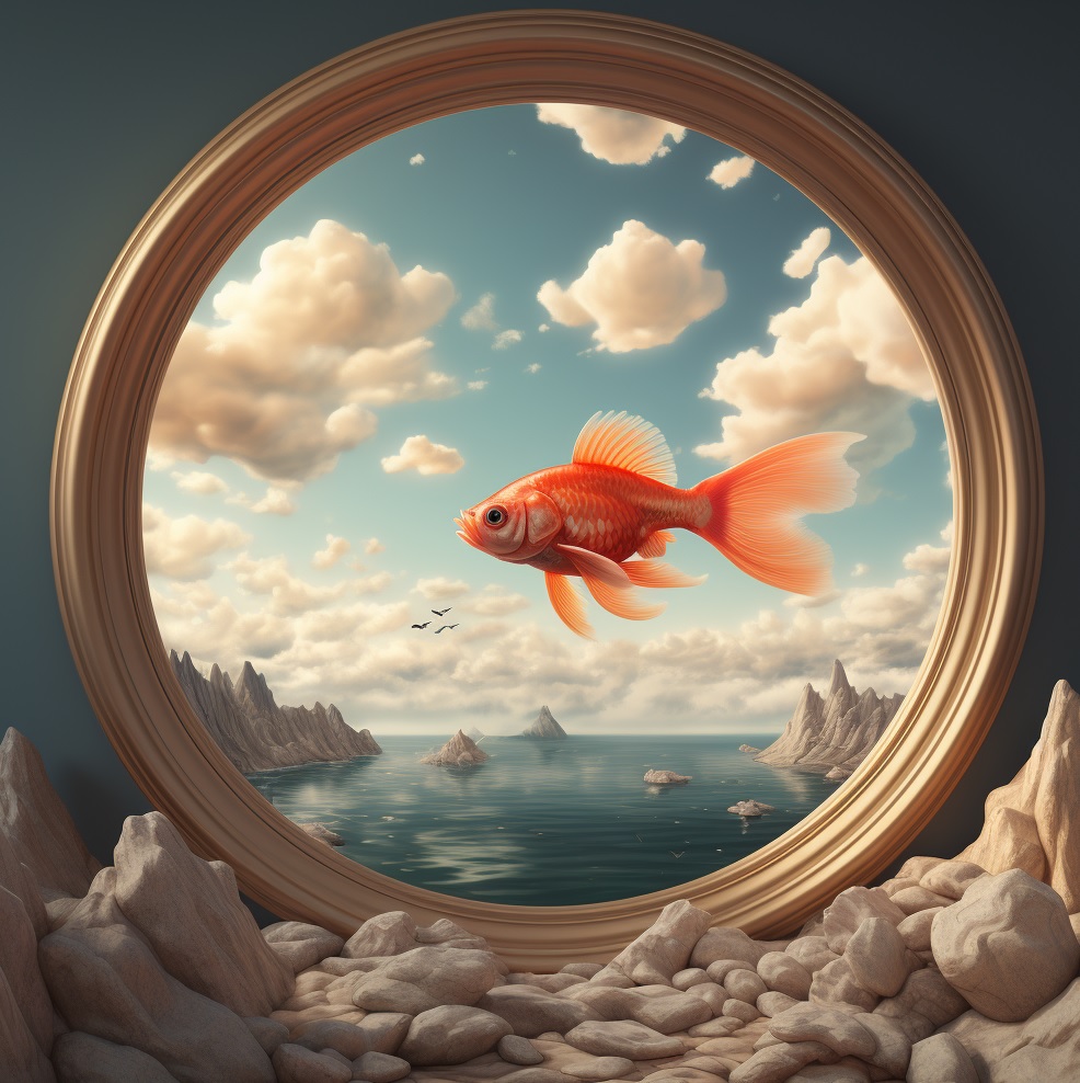 A goldfish drifting through a framed portal, turning the horizon into an aquarium.
