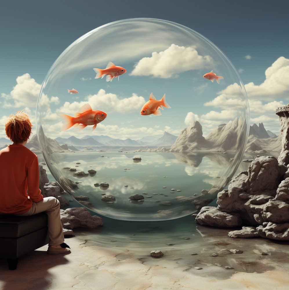 A human watcher meets a vast bubble-world where fish float like drifting thoughts.