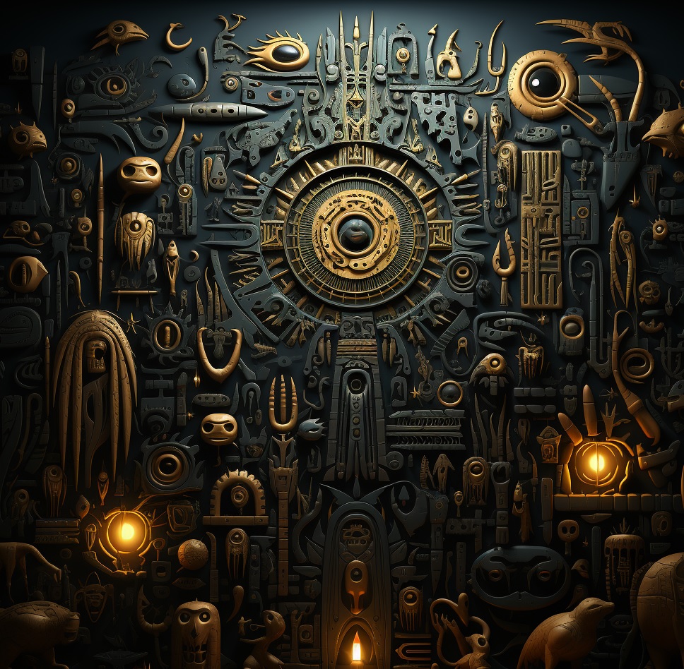 A monumental wall of totems and faces forming a visual archive of forgotten cultures.