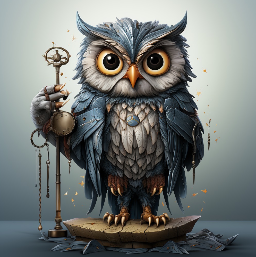 A wide-eyed owl stands like a guardian, holding an ornate key to an unseen door.