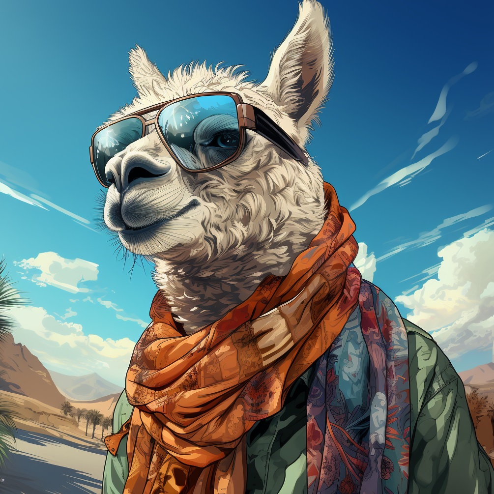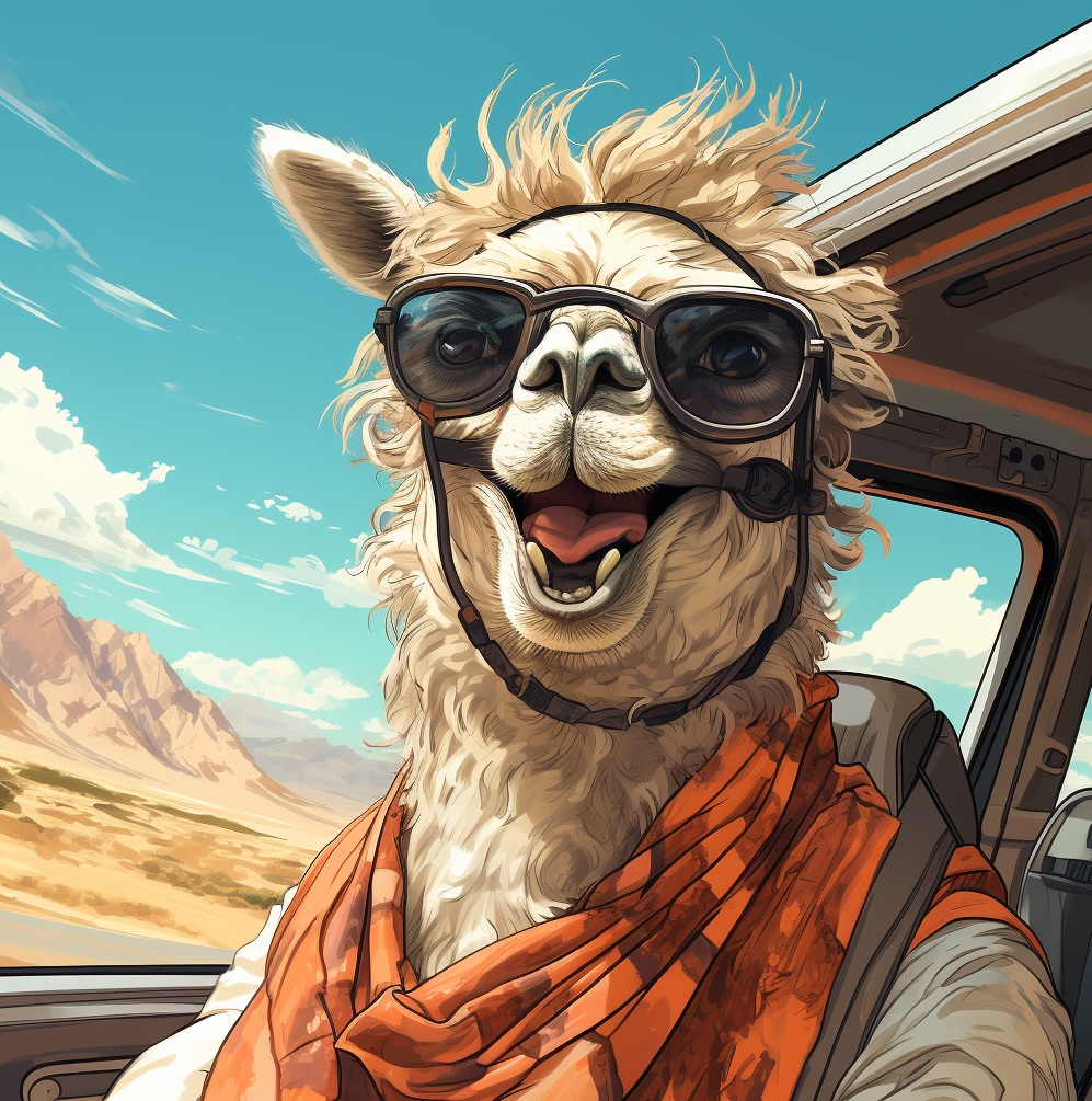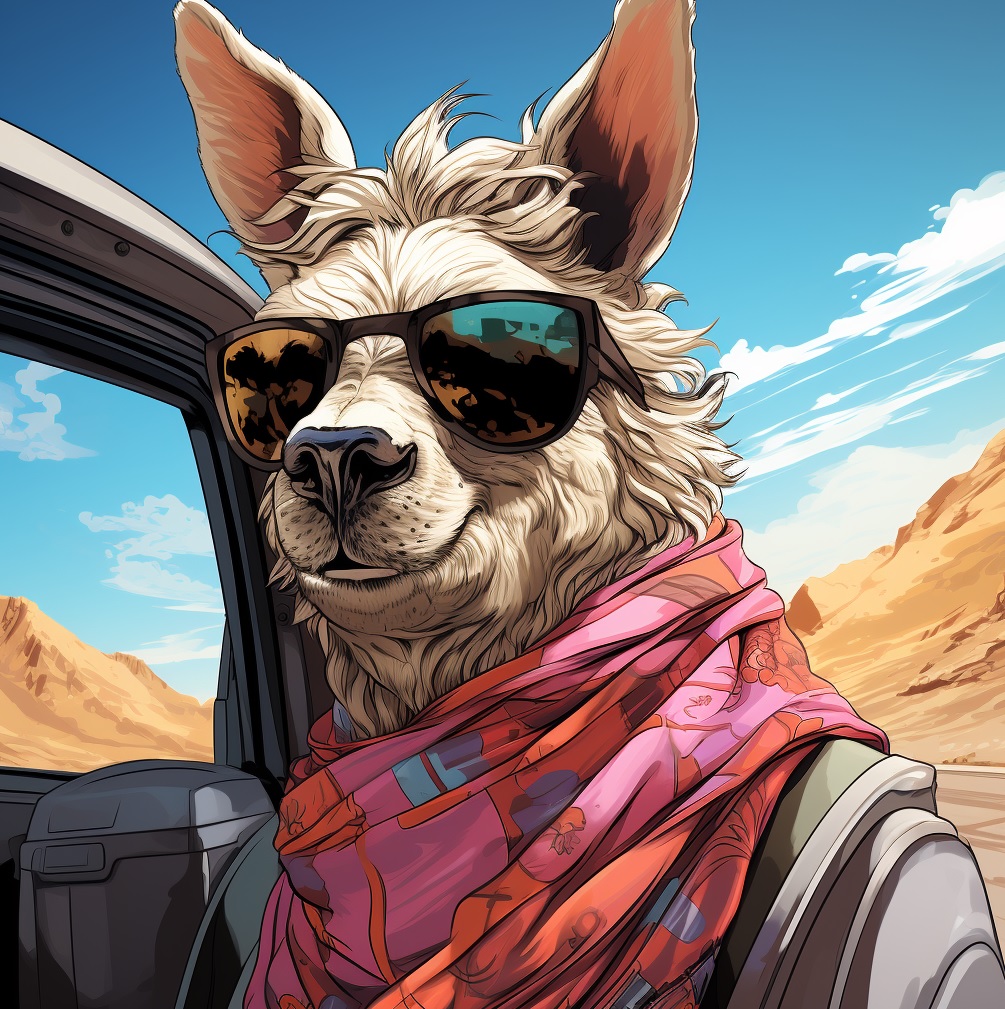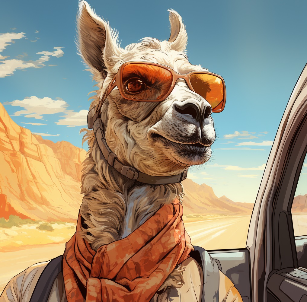 A stylish llama catches the desert light mid-roadtrip, framed like a cinematic postcard.