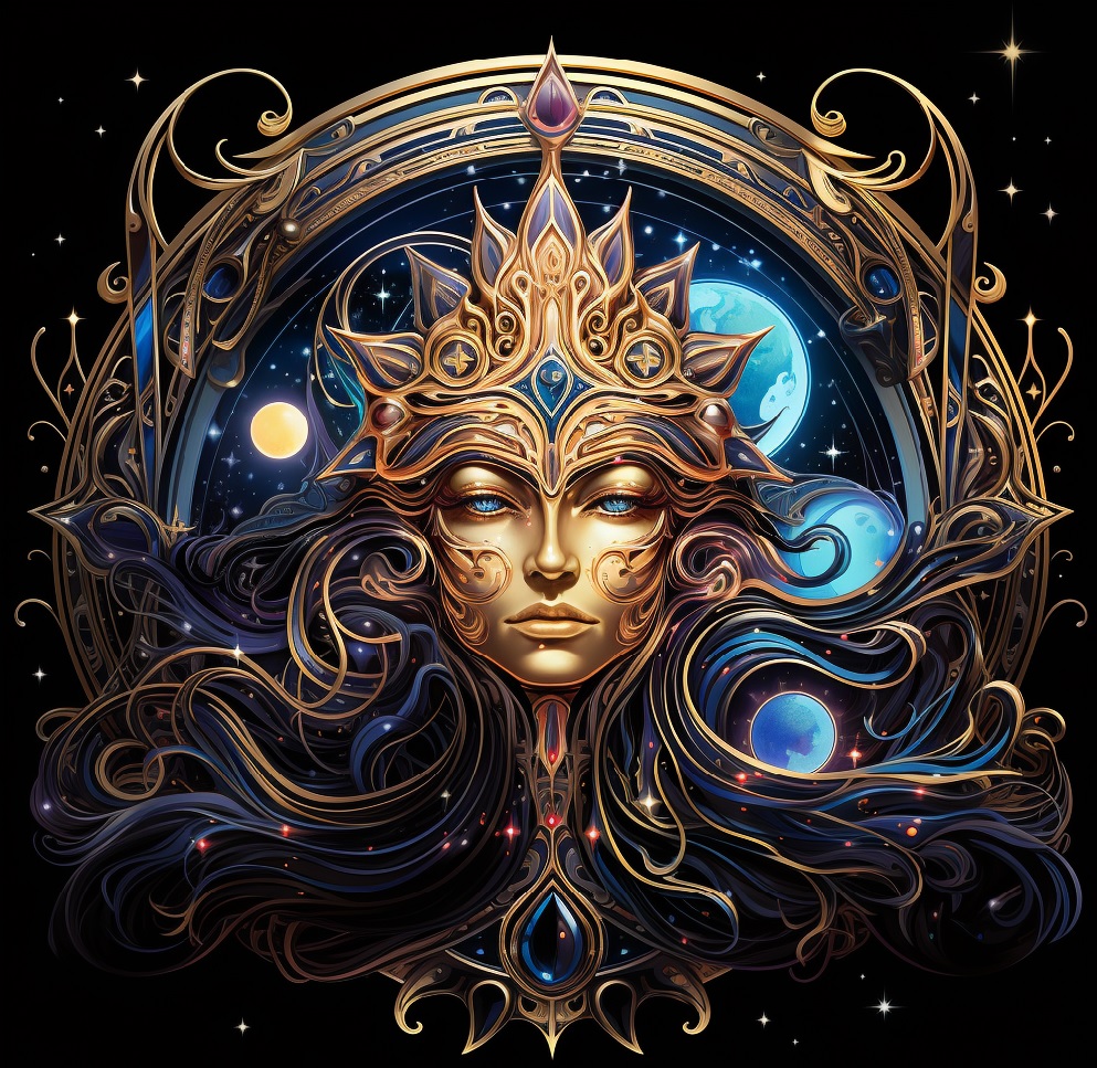 An ornate celestial visage crowned with cosmic geometry and star-lit filigree.