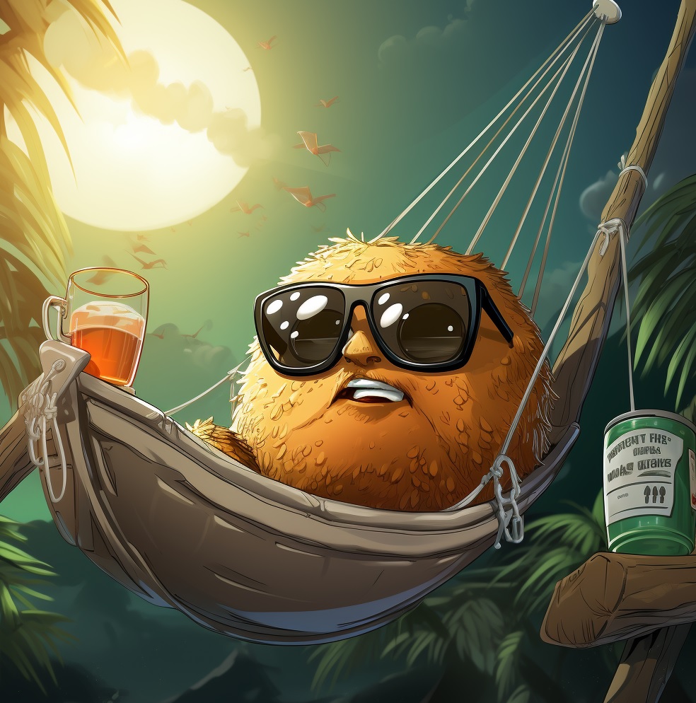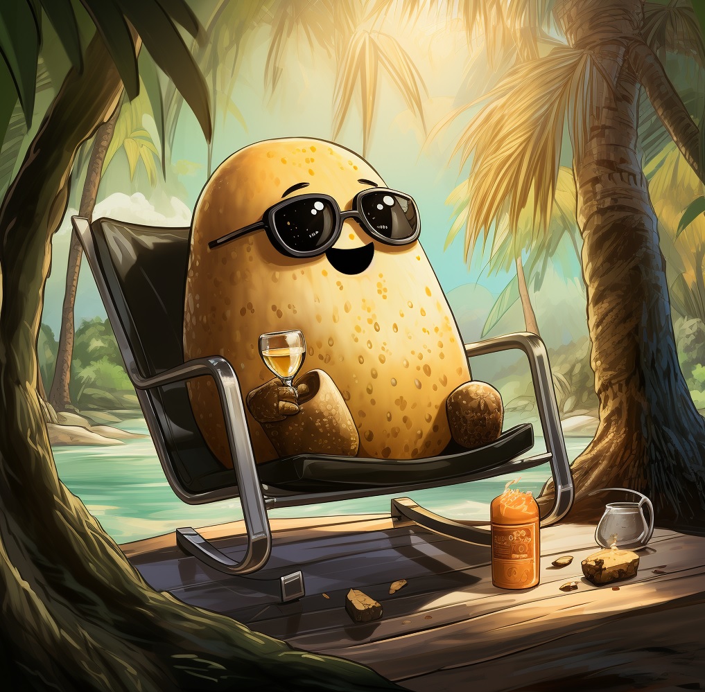 A potato lives the high life: sunglasses, a drink, and a slow day by the water.