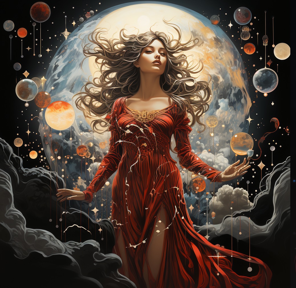 A dreamlike figure in crimson moves through a field of planets and suspended light.